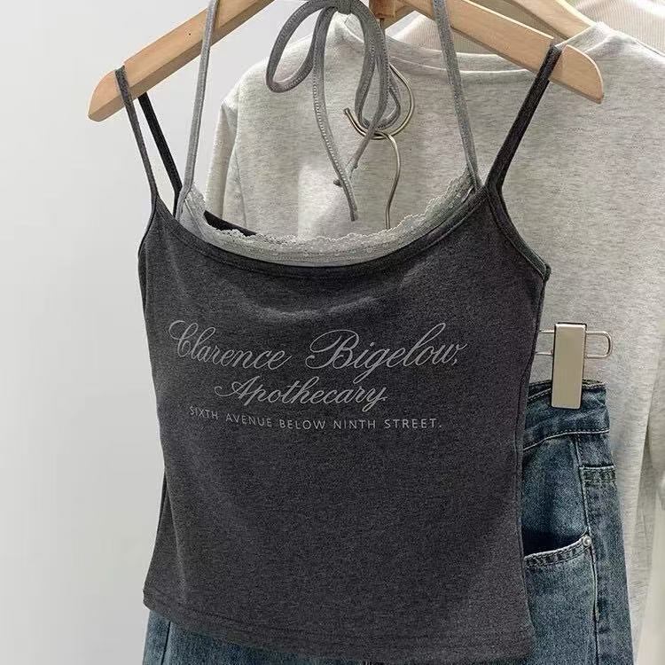 レタープリント 配色デザイン ホルターネック キャミソール タンクトップ 夏 レトロ風 フェイクレイヤード トップス レディース