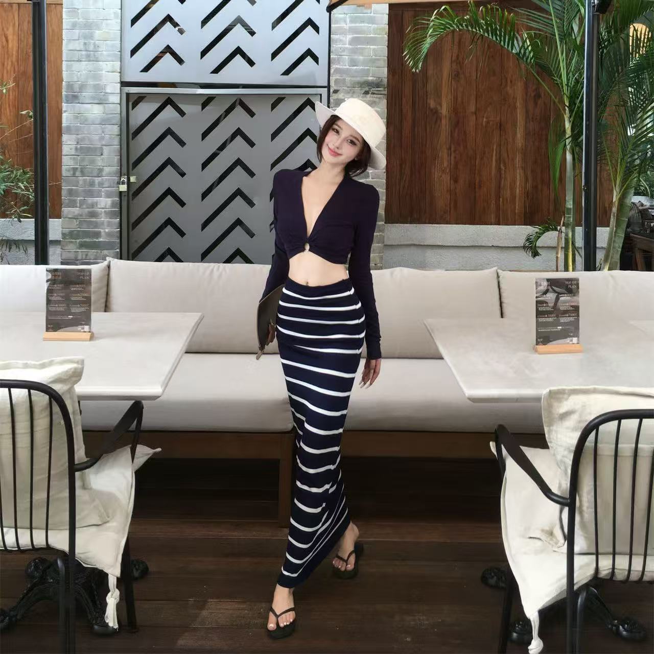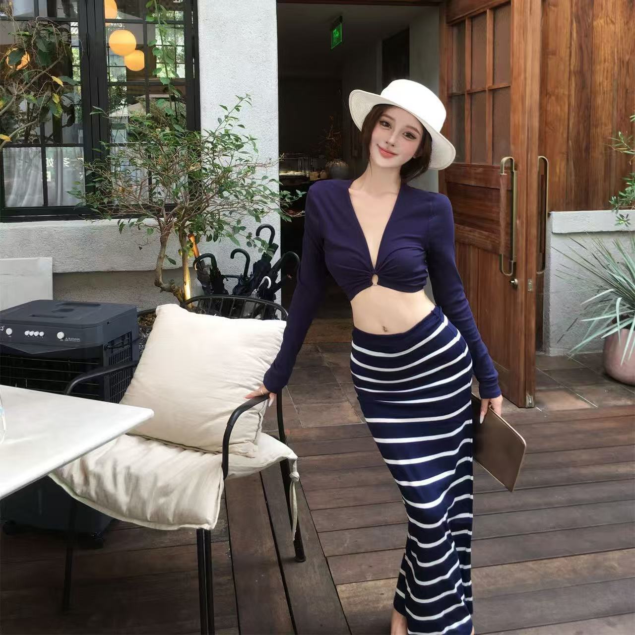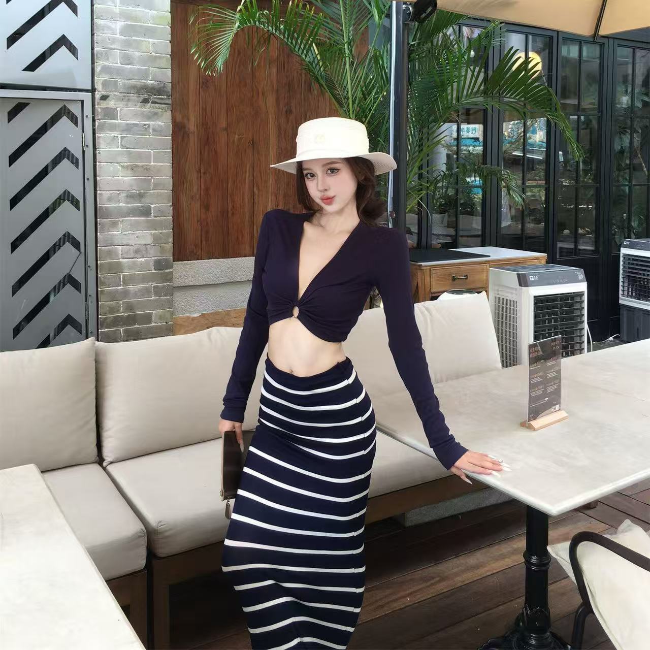 新作 ネイビーVネック水着 3点セット 長袖×半袖 ストライプ タイトスカート付き 大人セクシー お姉さん系 温泉 海 リゾート