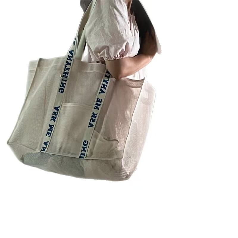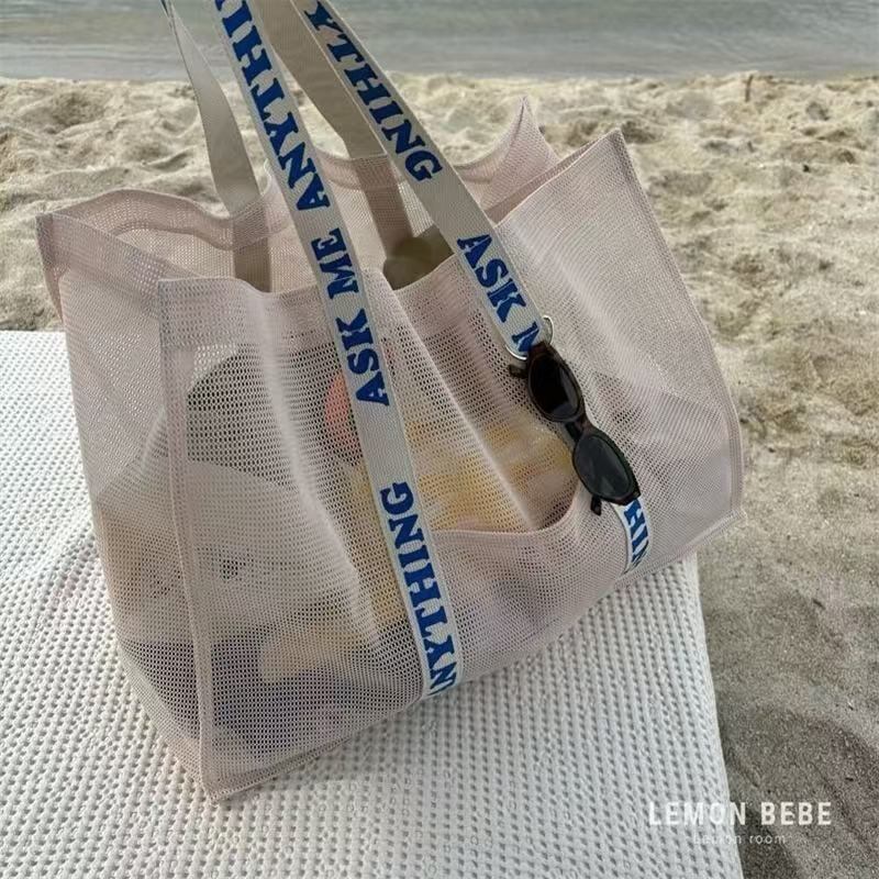 韓国風インスタ人気 メッシュスイムバッグ ワンショルダー 大容量 ビーチバッグ おしゃれ 旅行・ジム・洗面用 水着収納バッグ